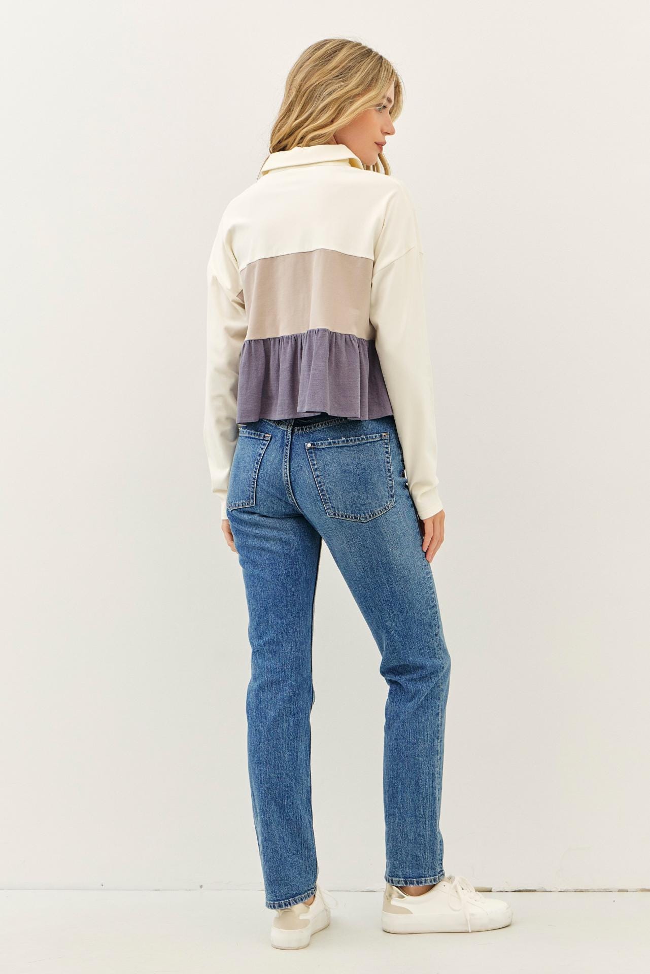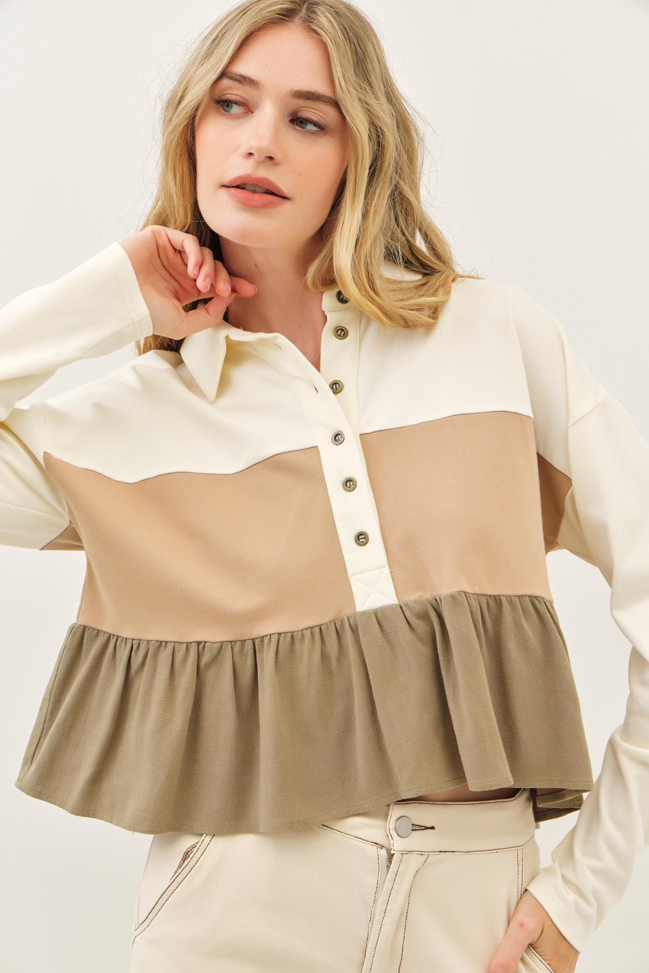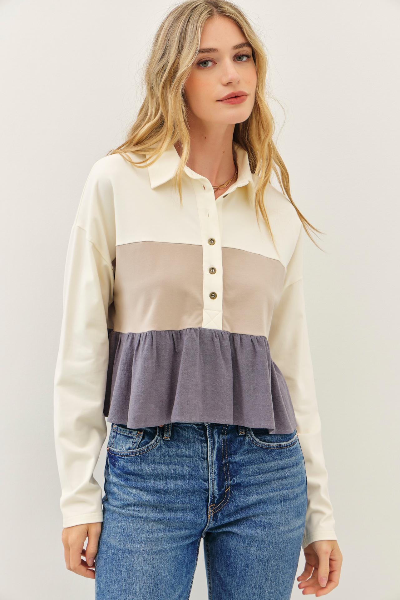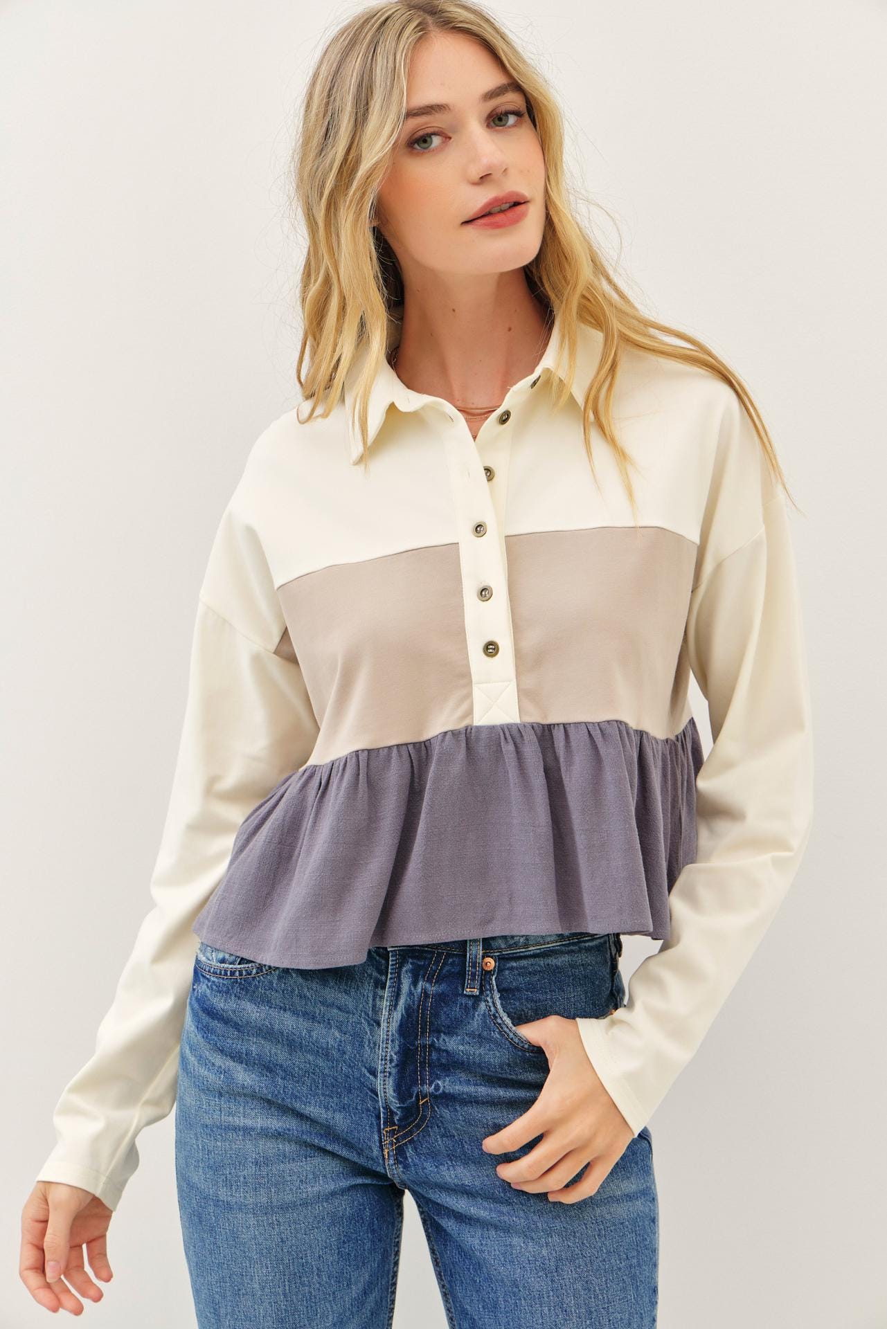This isn’t just another long sleeve top—it’s the one you’ll reach for again and again. Made from an ultra-soft cotton jersey and mixed with airy rayon-linen gauze, this color block tiered top feels as dreamy as it looks.