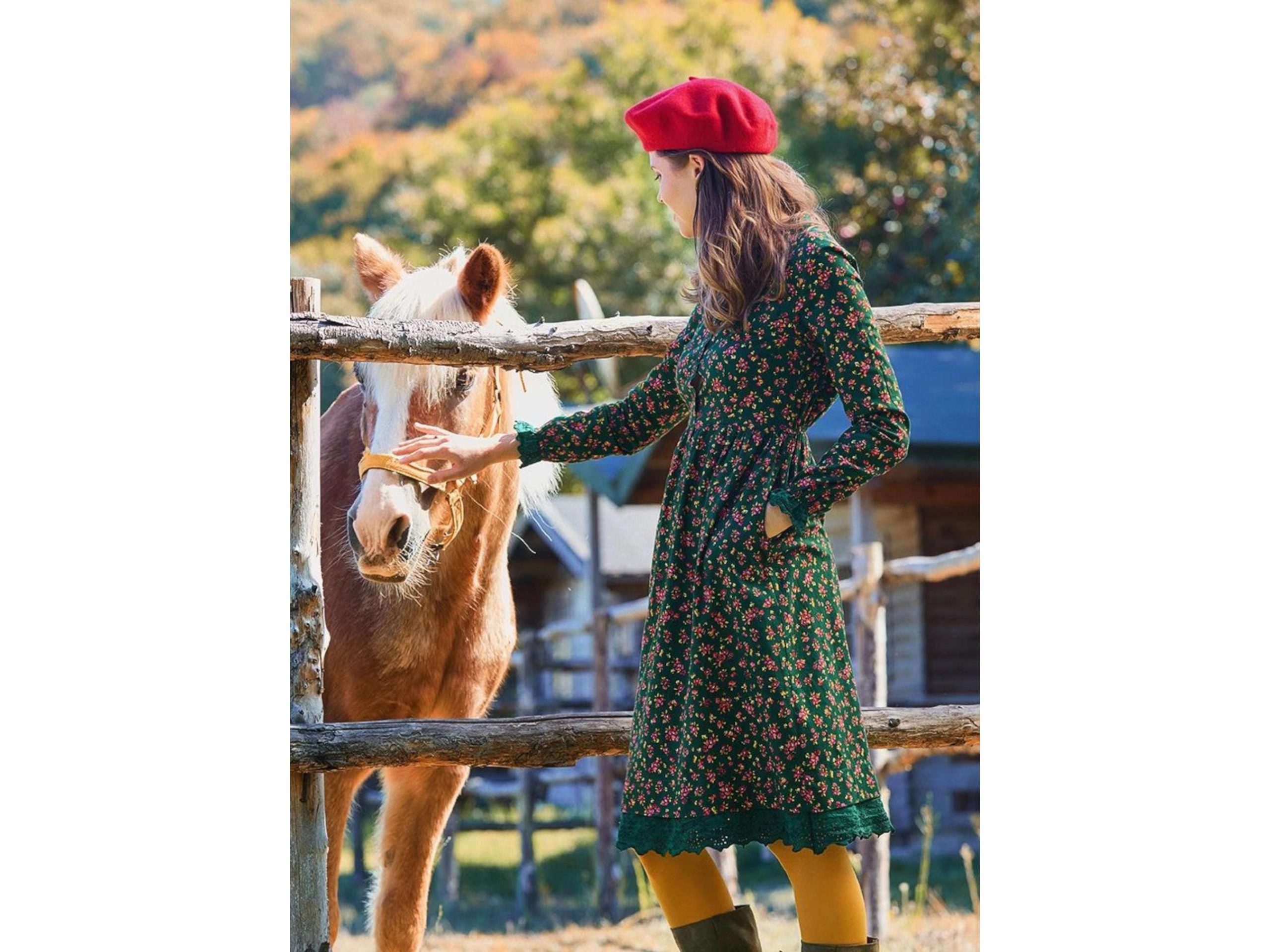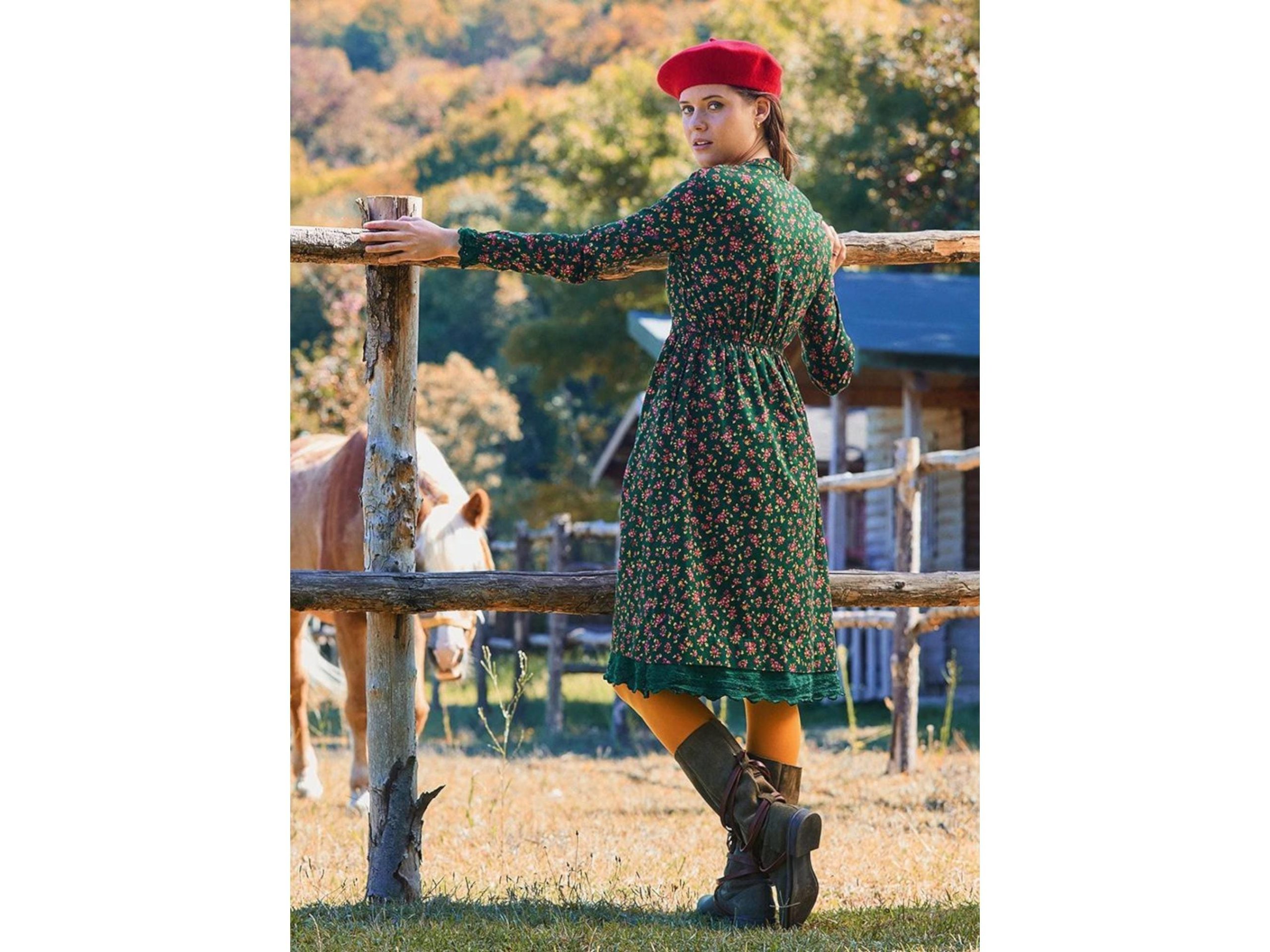 Elegance meets timeless style with this High-Neck Green Floral Dress featuring Lace Details and an Elastic Waist.